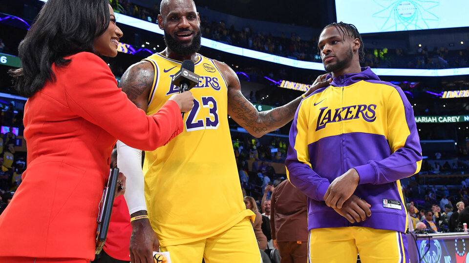 De 39 y 20 años, respectivamente, LeBron (titular) y Bronny (suplente) protagonizaron una imagen memorable cuando se pararon al mismo tiempo y entraron juntos a la cancha a falta de cuatro minutos en el segundo cuarto para convertirse en el primer padre e hijo que juegan juntos en la mejor liga de básquetbol del planeta. «¿Estás listo?», le dijo LeBron a Bronny segundos antes de que el coach Redick ordenara el doble cambio que quedará en la historia de la competencia.
