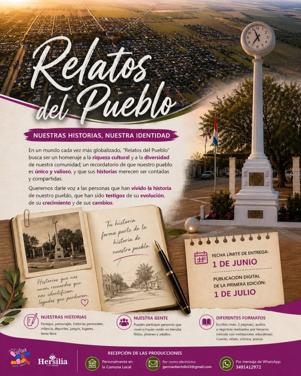 Esta propuesta nace con el deseo de darle voz a las personas que han vivido la historia de Hersilia, que han sido testigos de su evolución, de su crecimiento y de sus cambios a lo largo del tiempo. Además, contará con la participación y el acompañamiento de instituciones culturales y educativas de la comunidad.
